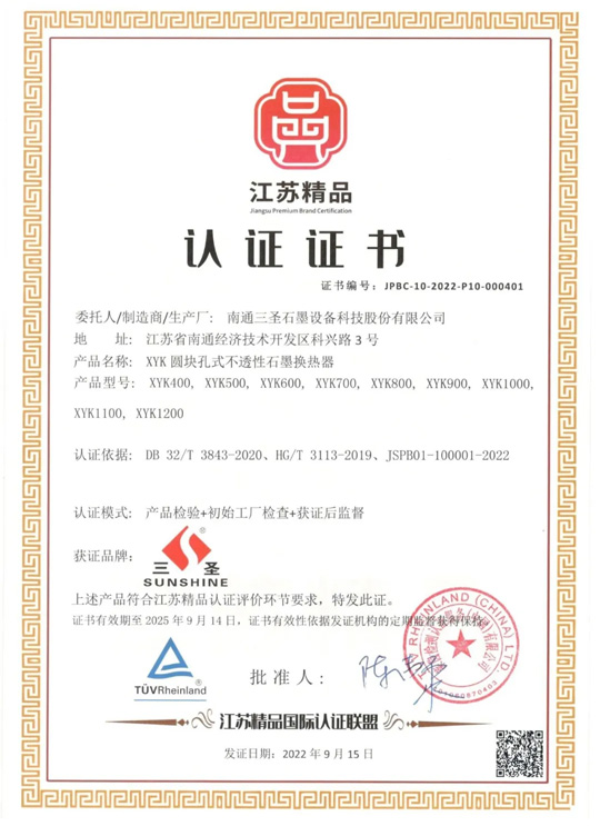 經(jīng)“江蘇精品”國際認證聯(lián)盟認證,南通三圣石墨設(shè)備科技股份有限公司榮膺“ 江蘇精品 ”認證 ,成功躋身“江蘇精品”優(yōu)質(zhì)制造業(yè)品牌。